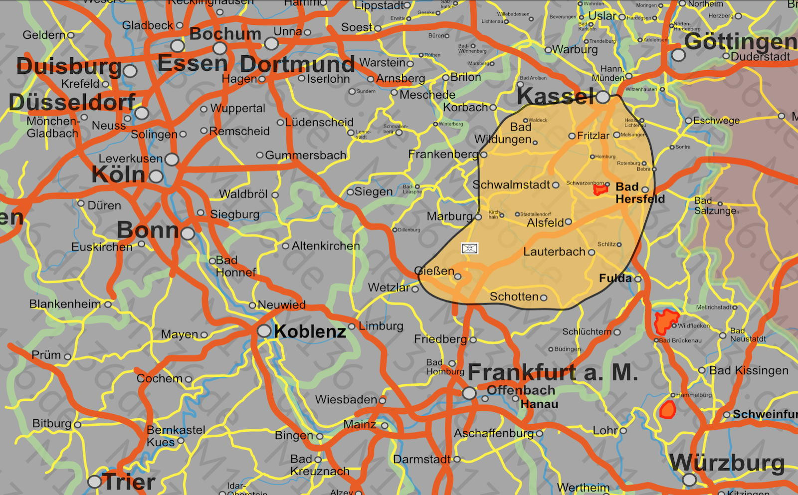 - Kassel, Homberg/Efze, Neukirchen, Schwalmstadt, Vogelsbergkreis, Frankenberg, Battenberg, Marburg, Biedenkopf, Gießen, Lauterbach, Neuenkirchen, Grebenhain, Bad Hersfeld, Lahntal, Wetzlar